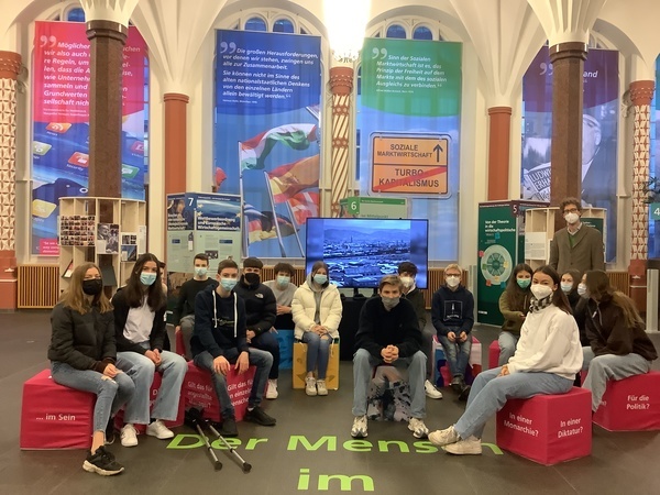 Diese Frage stellen wir uns derzeit im Unterricht des Leistungsfaches Gemeinschaftskunde im Hinblick auf die Gestaltung einer sozial gerechten Gesellschaft. Und dies ist auch der Titel einer derzeit vom Walter-Eucken-Institut ausgerichteten Ausstellung zur Entwicklung der sozialen Marktwirtschaft, die der Kurs am Donnerstag, 25.11., im Rahmen einer Exkursion besuchte.Begleitet durch einen Kurzvortrag von Prof. Dr. Tim Krieger von der Universität Freiburg wurde die Bedeutung Walter Euckens und der Freiburger Schule für die Entstehung der sozialen Marktwirtschaft in Deutschland nach 1945 erläutert und bis hin zu den zentralen Fragen der Gegenwart nach einer europäischen Sozialstaatlichkeit aufgezeigt: Wie sind Wettbewerb und Solidarität zukünftig in einer immer globalisierteren Welt miteinander zu vereinbaren?